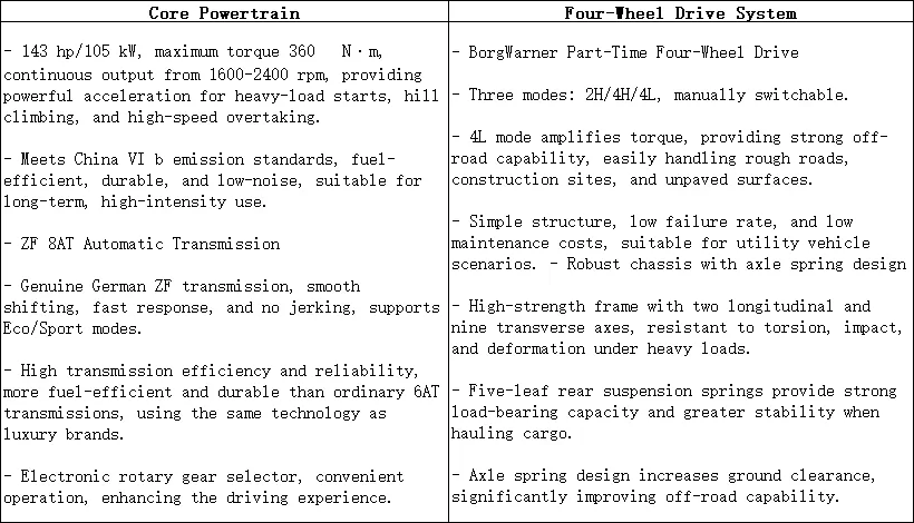 Модель RE-MAX 2.5T Automatic 4WD 2026 года может похвастаться основными преимуществами дизельного двигателя Isuzu 2.5T + трансмиссии ZF 8AT + частичного полного привода BorgWarner + шасси HanDun, подчеркивая простоту использования, надежность полного привода, долговечность в тяжелых условиях и пригодность как для семейного, так и для коммерческого использования.