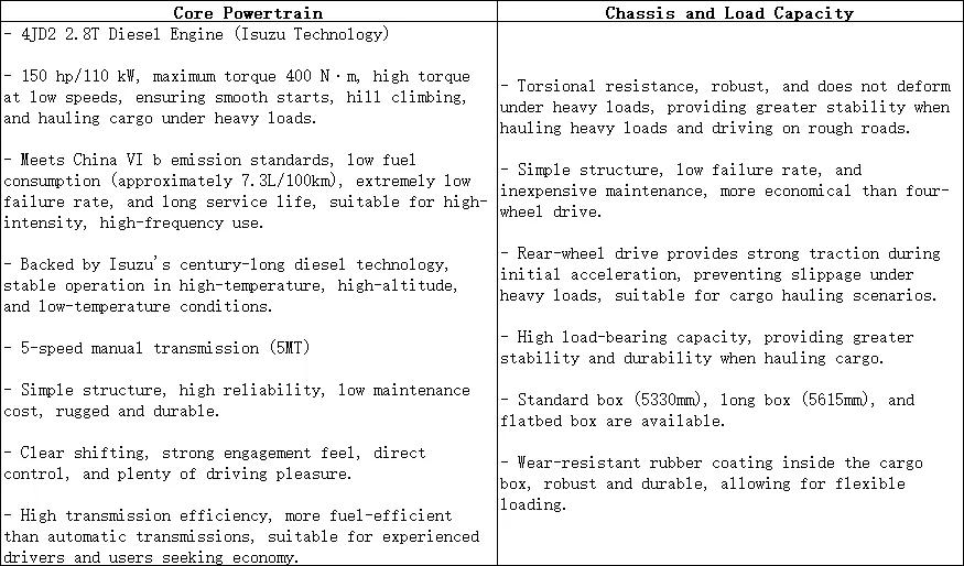 Основными преимуществами пикапа RE-MAX 2.8T 2.8T с механической коробкой передач 2WD 2026 года являются его классический дизельный двигатель Isuzu большого объема + механическая коробка передач 5MT + задний привод + прочное шасси. Он подчеркивает долговечность, высокую производительность при тяжелых нагрузках, топливную экономичность и быструю окупаемость инвестиций, что делает его лучшим выбором для пользователей с чисто коммунальными потребностями и ограниченным бюджетом.