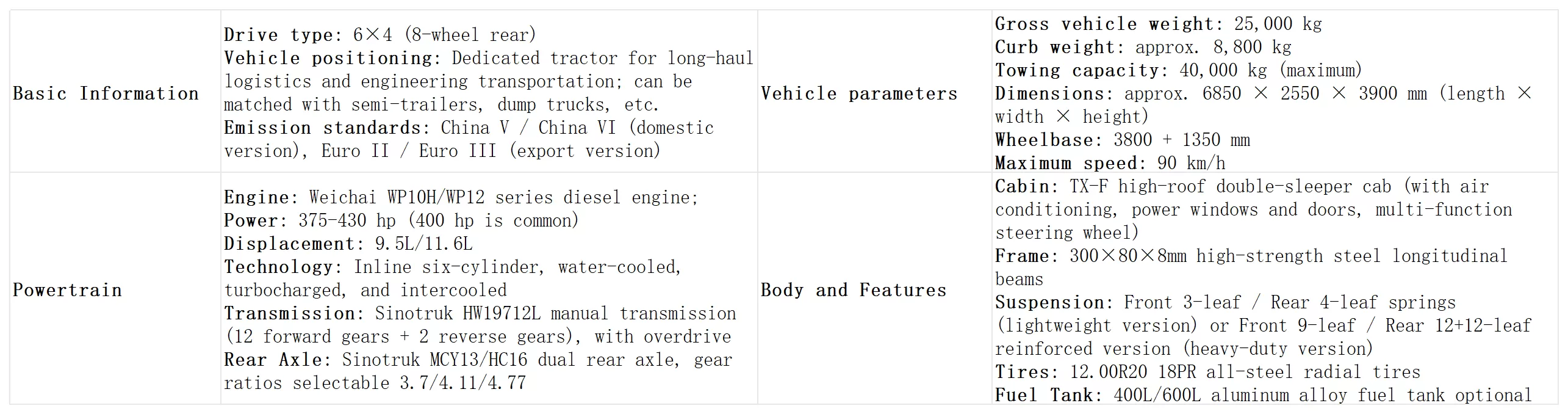 Основные параметры тягача Sinotruk Howo TX 6×4 (версия шасси) следующие::
